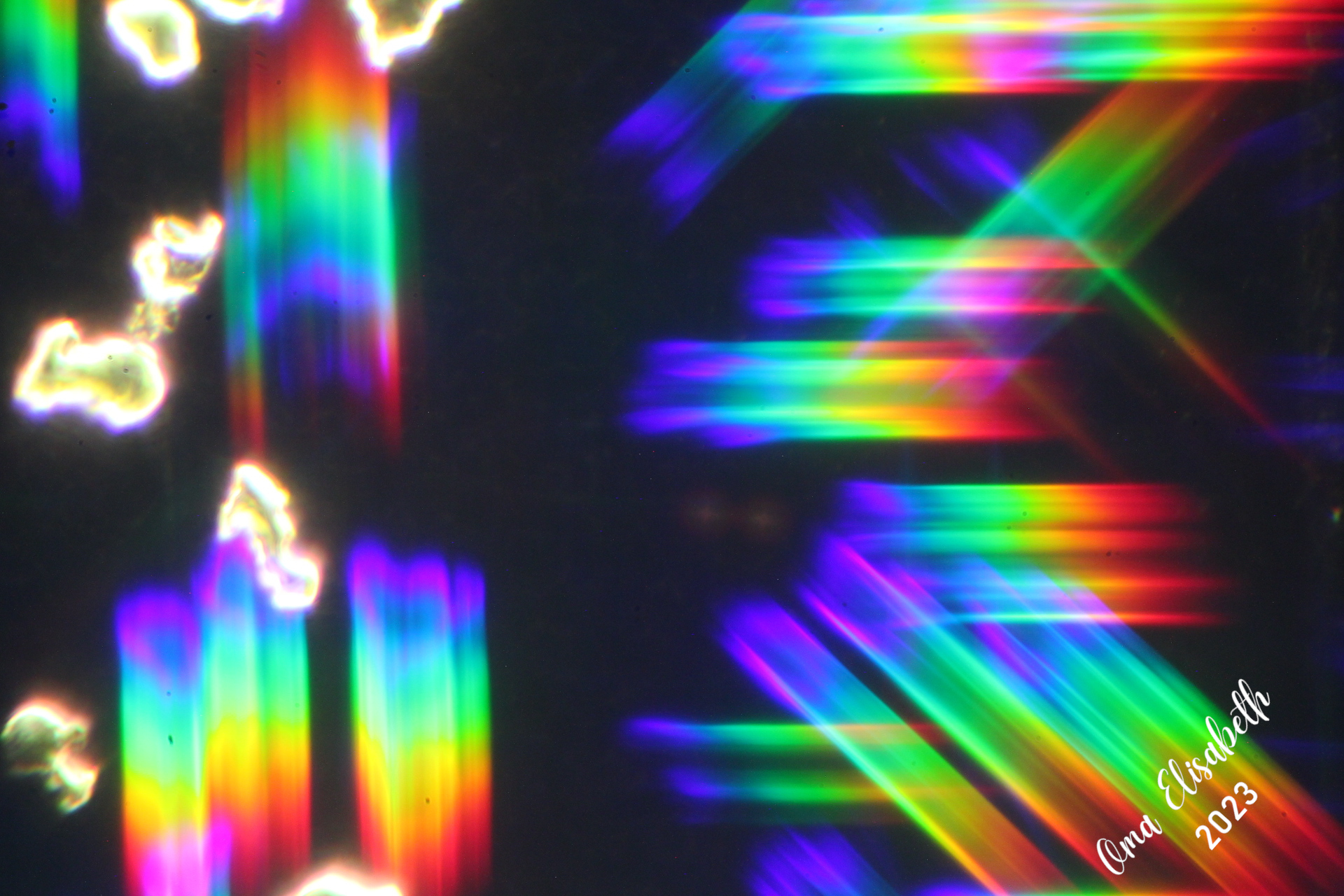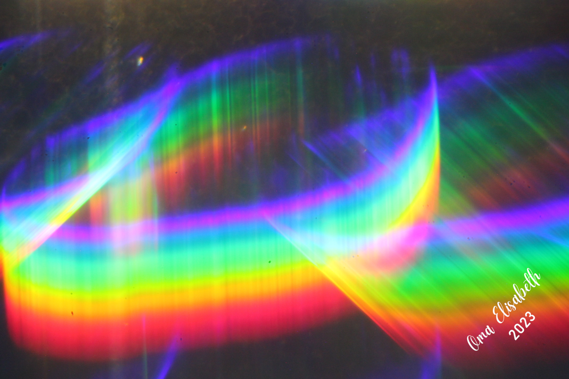 Das Bild zeigt ein faszinierendes Farbspiel, das an ein Spektrum aus Licht oder eine Lichtbrechung erinnert – wie bei einem Prisma oder einer holografischen Projektion. Es wirken leuchtende Farben mit fließenden, geschwungenen Linien, die sich überlagern und teilweise wie Nebel oder Schleier wirken. Die Farben wirken dabei fast dreidimensional.