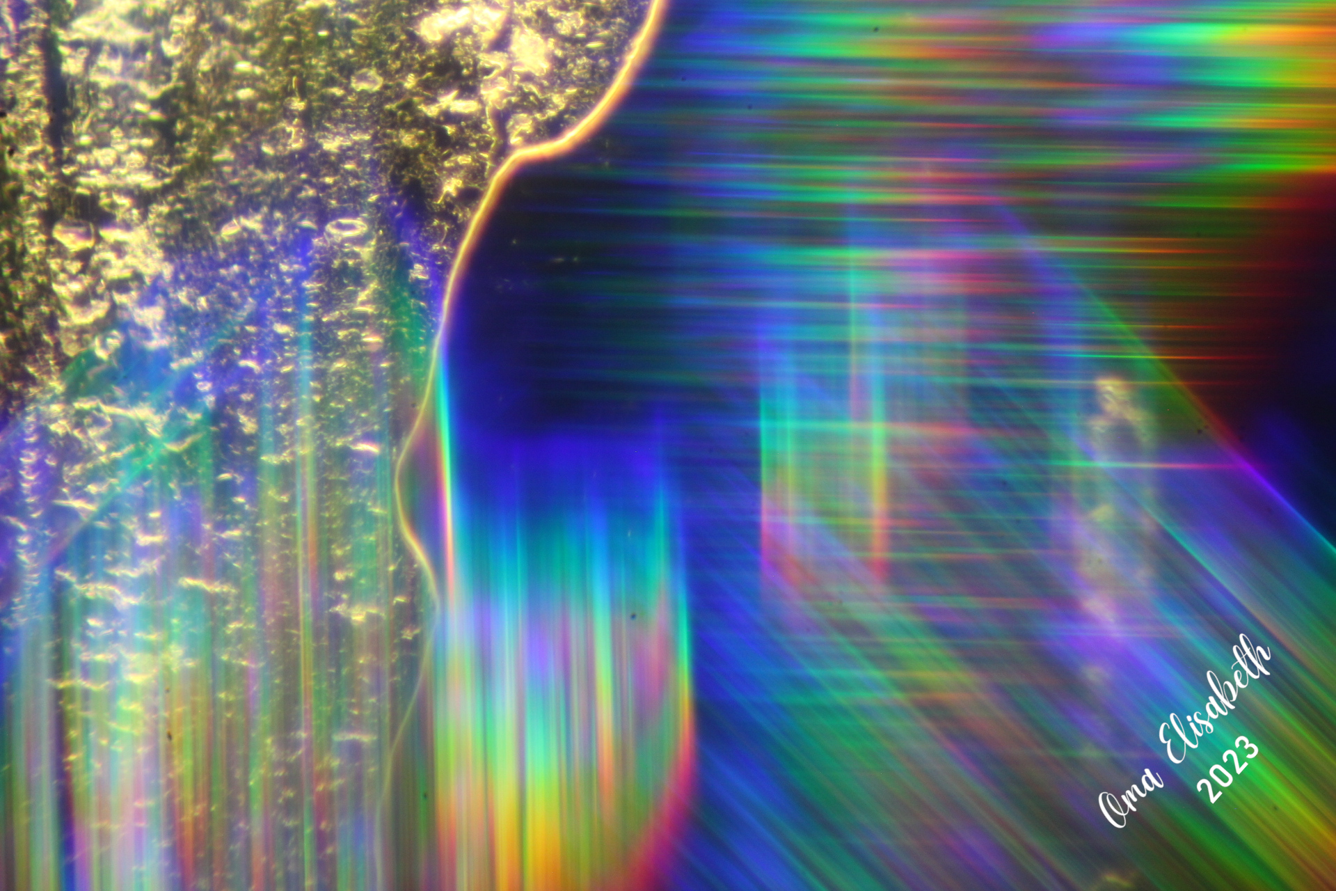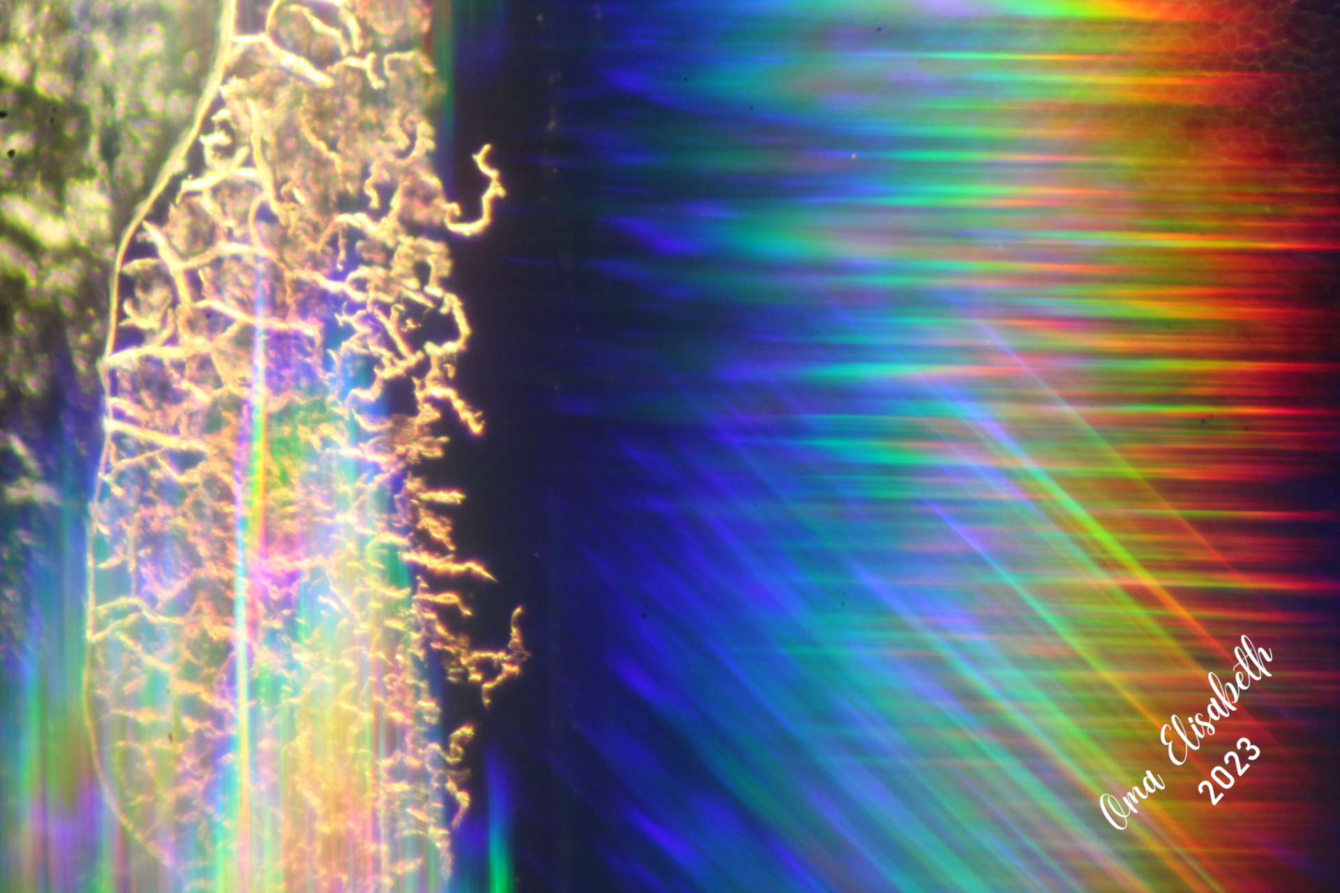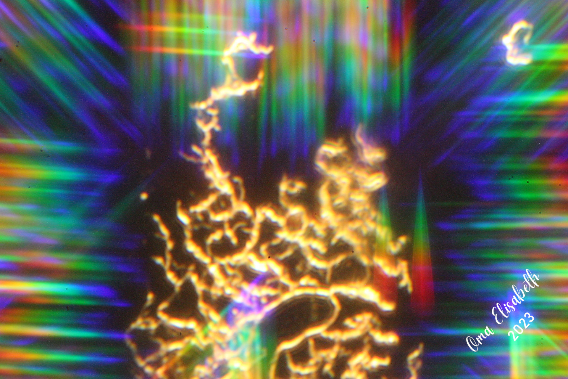Das Bild zeigt ein abstraktes, farbenfrohes Muster, die sich in schimmernden Streifen und Wirbeln über einen dunklen Hintergrund erstrecken. Im Zentrum befindet sich eine organisch geformte, gold-orange Struktur, die an Flammen oder verzweigte Korallen erinnert, erzeugt durch einen prismatischen Lichtbrechungs-Effekt. Die Gesamtwirkung ist dynamisch und hypnotisch, mit einem Mix aus natürlichen und synthetischen Elementen.