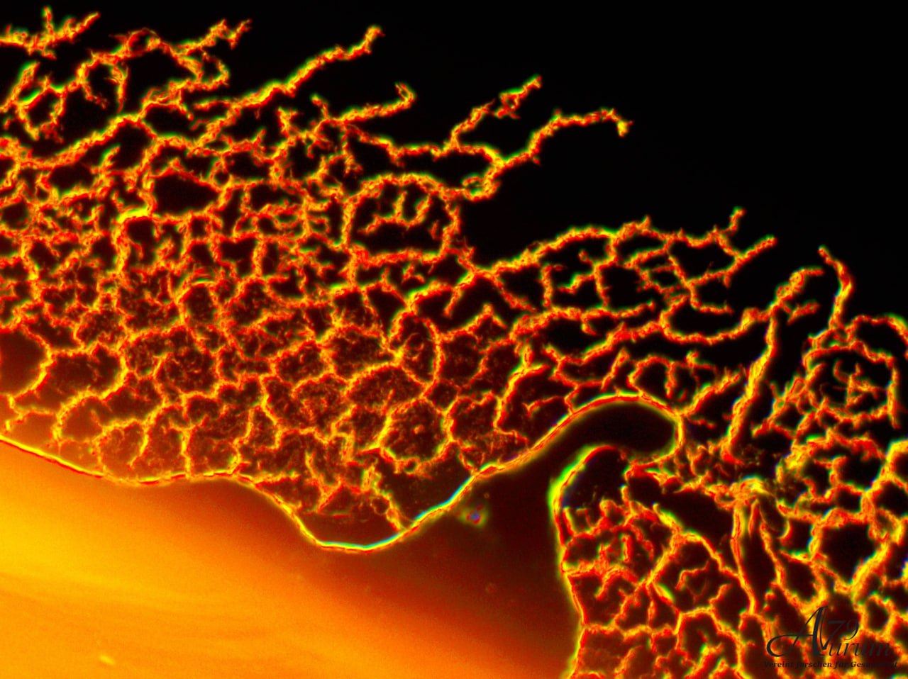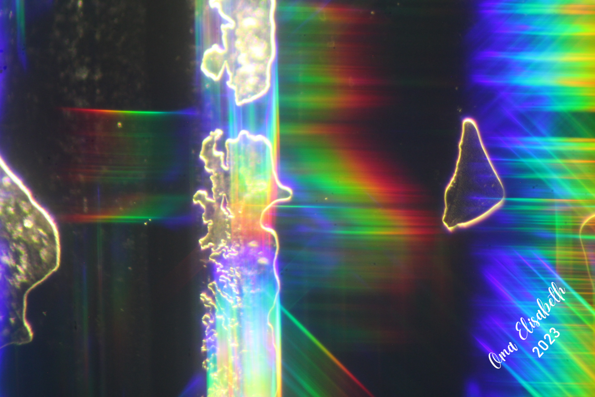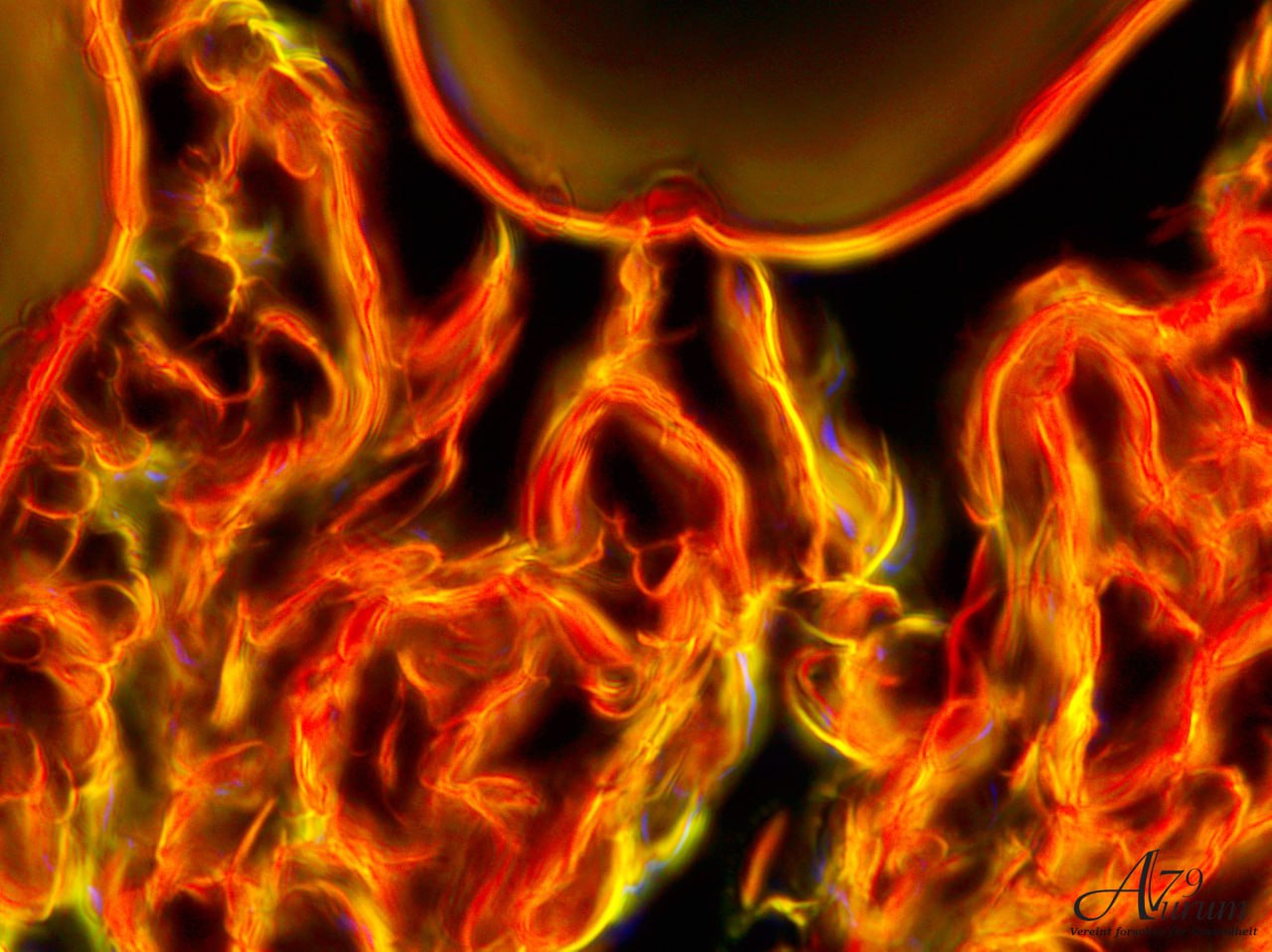 Das Bild zeigt ein abstraktes, farbenfrohes Muster, die sich in schimmernden Streifen und Wirbeln über einen dunklen Hintergrund erstrecken. Im Zentrum befindet sich eine organisch geformte, gold-orange Struktur, die an Flammen oder verzweigte Korallen erinnert, erzeugt durch einen prismatischen Lichtbrechungs-Effekt. Die Gesamtwirkung ist dynamisch und hypnotisch, mit einem Mix aus natürlichen und synthetischen Elementen.