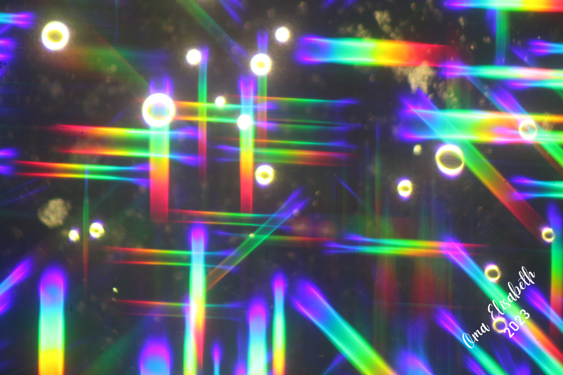 „Im Verborgenen tanzt das Licht, breitet sich aus wie ein Flüstern, das in Farben spricht, jenseits von Worten und Gestalt. Jede Linie, jede Kurve erzählt von Zeiten, die nicht ticken, von Räumen, die sich weiten und verschließen, wo Realität und Traum sich berühren. Glasige Welten brechen auf, zerbrechen in Regenbogenfragmente, ein Kaleidoskop aus Sehnsucht und geheimen Pfaden des Lichts. Die Farben weben ein Gedicht, nicht mit Buchstaben, sondern mit Strahlen und Schatten, eine Meditation in Blau, Grün und Purpur. Hier wird das Unsichtbare sichtbar, das Stille laut und das Flüchtige ewig.“