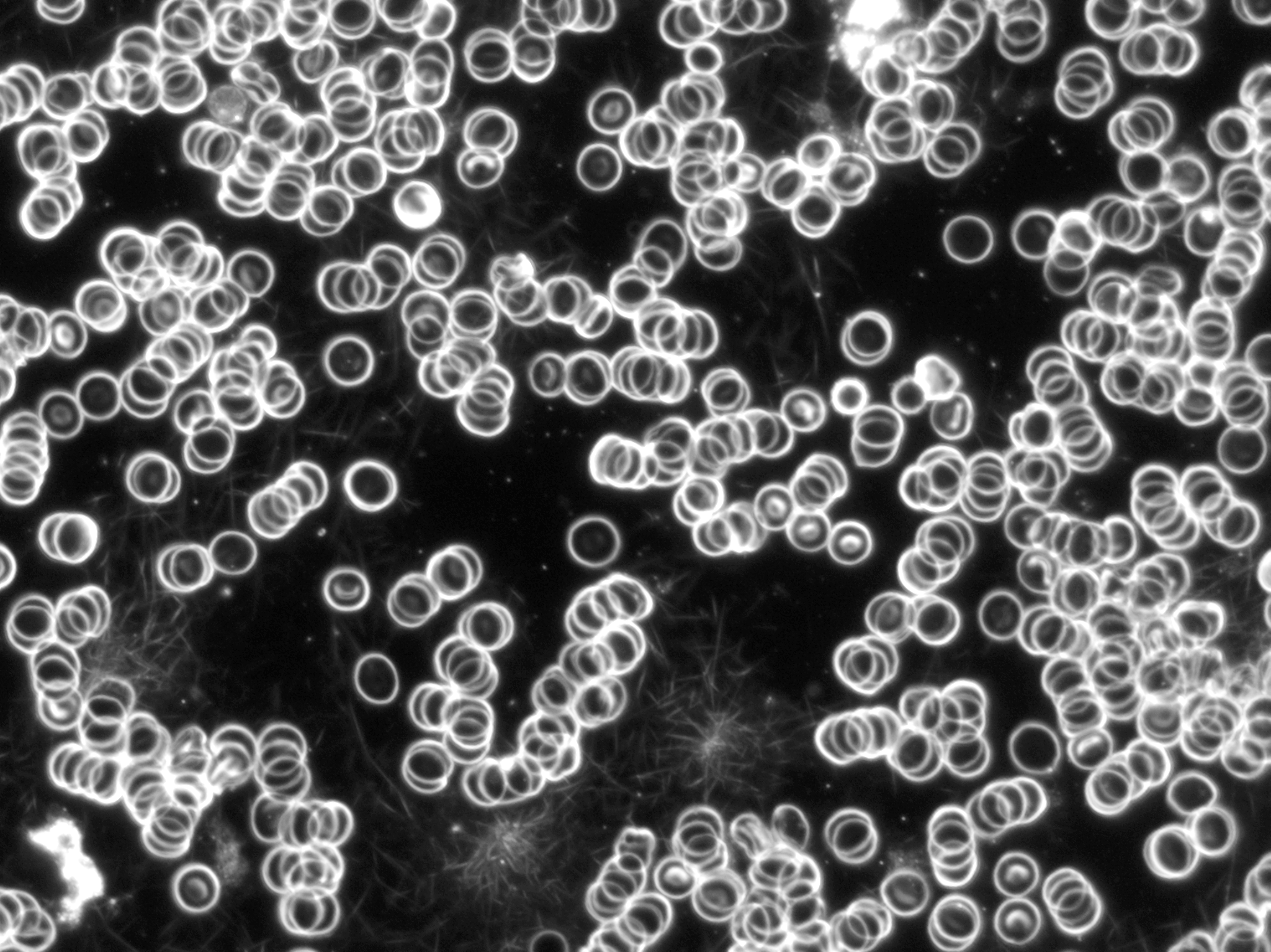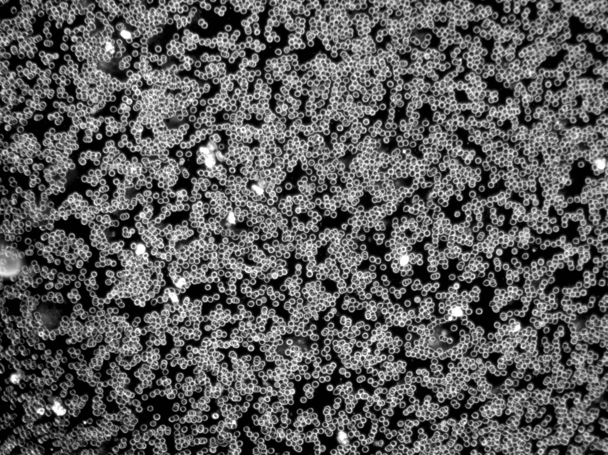 Dichtem Vorkommen von kreisförmigen Zellen. Leichte Aggregationen sichtbar, aber keine eindeutigen abnormalen Formen oder Parasiten erkennbar. Weitfeld-Okulare mit 10-facher Vergrößerung & 10x Objektiv