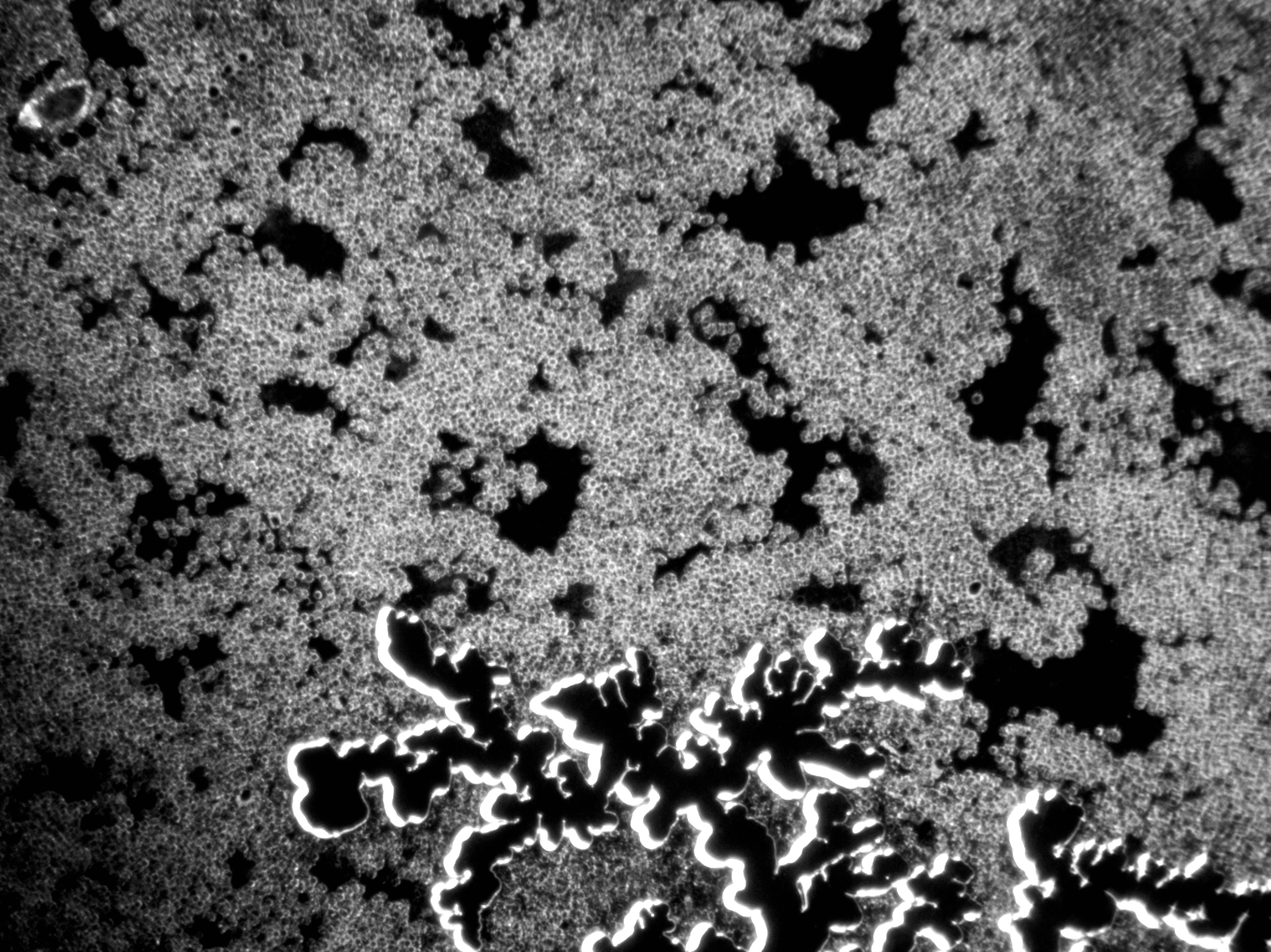 Offenbart ein dichtes Netzwerk mit unregelmäßigen, verzweigten Strukturen, möglicherweise Fibrin oder Zelltrümmer. Weniger erkennbare Zellen, könnte auf eine Entzündungsreaktion oder Gewebsschädigung hinweisen. Weitfeld-Okulare mit 10-facher Vergrößerung & 10x Objektiv