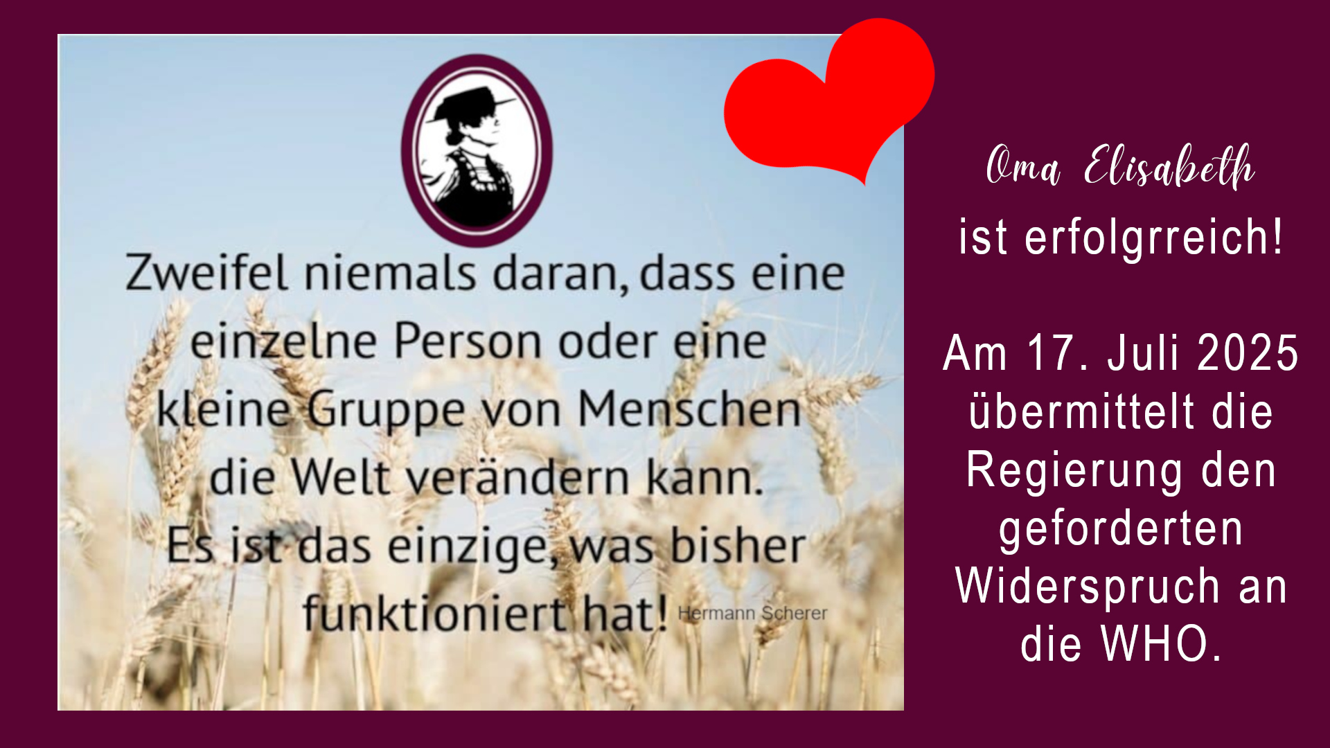 Am 17. Juli 2025 übermittelt die österreichische Regierung, den von mir geforderten Widerspruch an die WHO. Der Widerspruch ist aber leider nur vorübergehend!