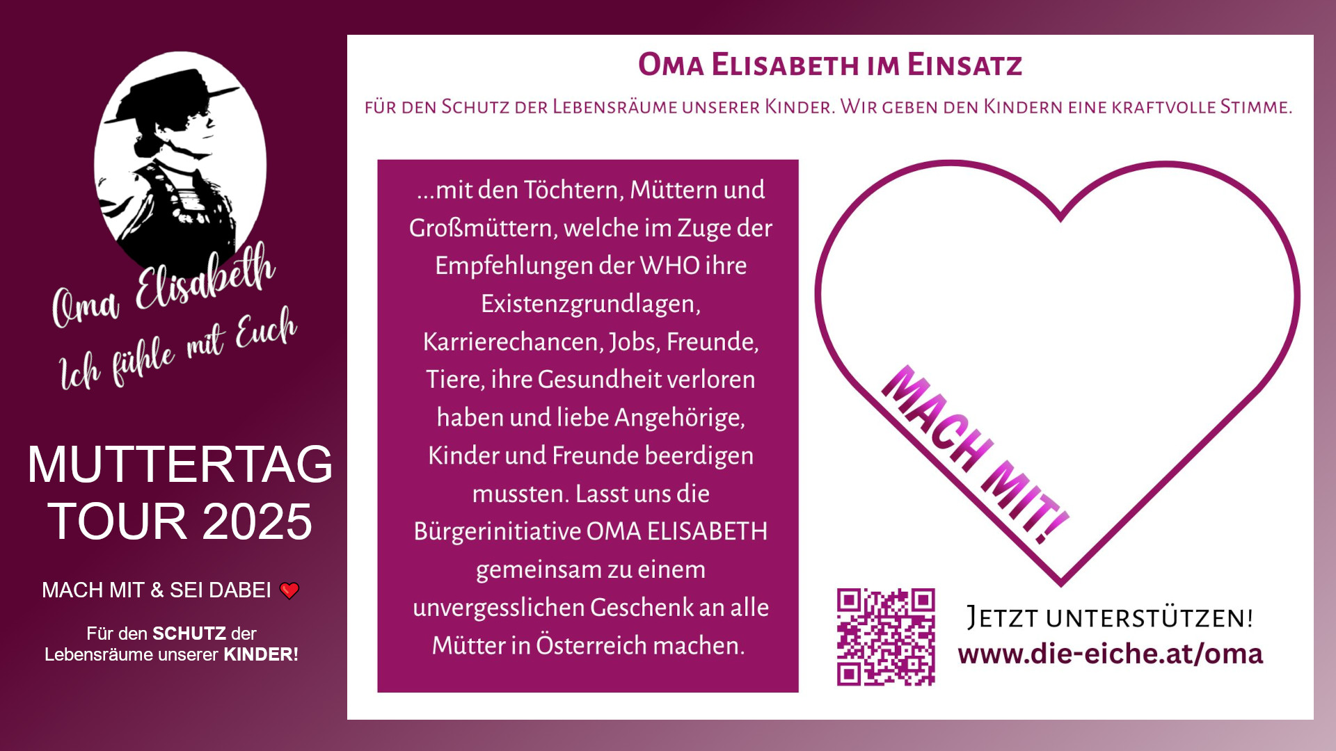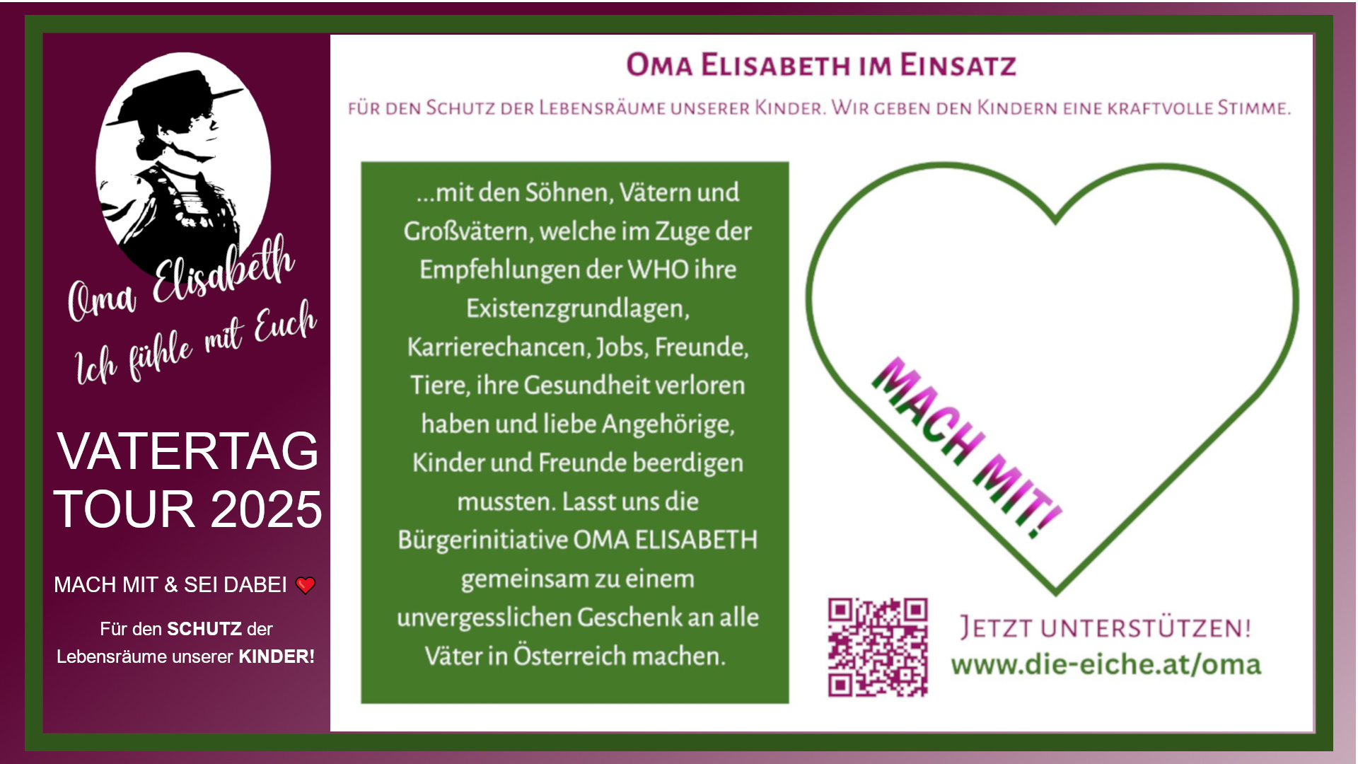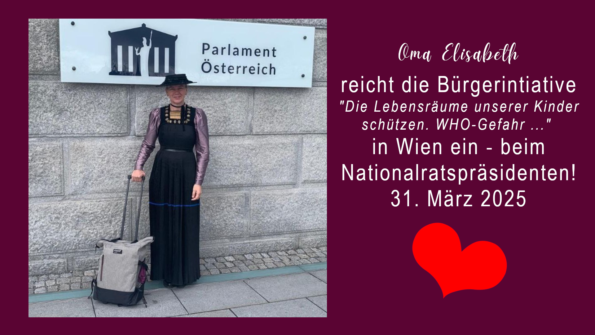 Oma Elisabeth reist im März 2025 durch ganz Österreich um Unterschriften für ihre Bürgerinitiative zu sammeln. Sie erhält das 5fache an Unterschriften für die Einreichung der Bürgerinitiative. Schützen wir gemeinsam unsere Kinder vor der Machtübernahme, durch supranationalen Organisationen wie der WHO.